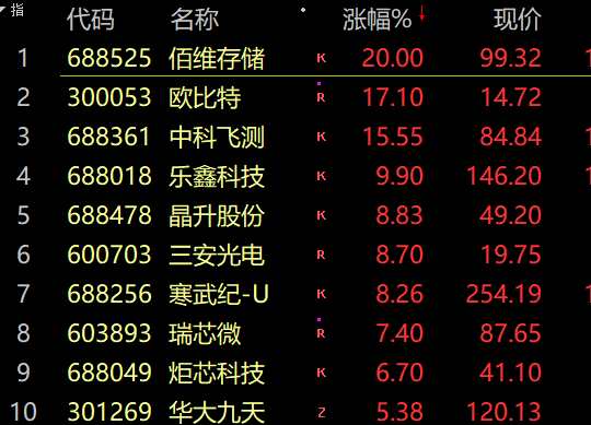 芯片概念午后走強,佰維存儲20cm漲停,睿能科技(603933)、冠石科技(605588)封板。