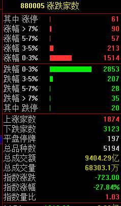 兩市共1874只個股上漲,3123只個股下跌。