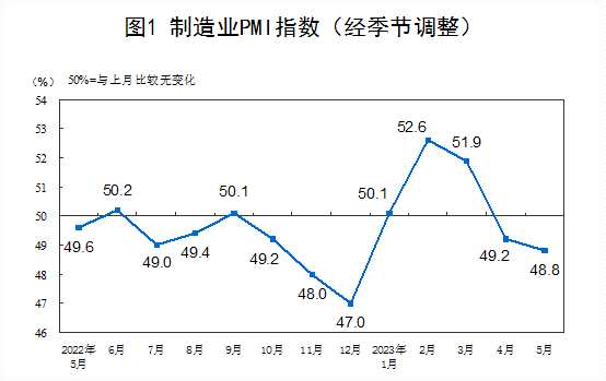 今天上午。國家統(tǒng)計局5月31日發(fā)布數(shù)據(jù)顯示,5月份,制造業(yè)采購經(jīng)理指數(shù)、非制造業(yè)商務活動指數(shù)和綜合PMI產(chǎn)出指數(shù)分別為48.8%、54.5%和52.9%,低于上月0.4個、1.9個和1.5個百分點。
