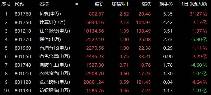 6月1日,行業(yè)漲多跌少,從31類申萬(wàn)一級(jí)行業(yè)看,有18類行業(yè)上漲,占比58.06%,傳媒行業(yè)漲幅居首,達(dá)2.62%,此外,計(jì)算機(jī)行業(yè)漲幅也超2%。下跌方面,家用電器居首,跌幅達(dá)1.96%,此外,公用事業(yè)和交通運(yùn)輸?shù)刃袠I(yè)跌幅也超1%。