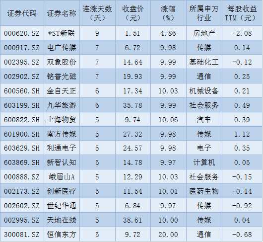 表:連續(xù)上漲5日且今日收盤漲停股一覽