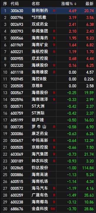 海南板塊方面,今日有9只海南個(gè)股漲停,其中,普利制藥(300630)領(lǐng)漲,上漲4.69%,報(bào)20.74元/股;*ST凱撒(000796)上漲3.19%,報(bào)3.56元/股。