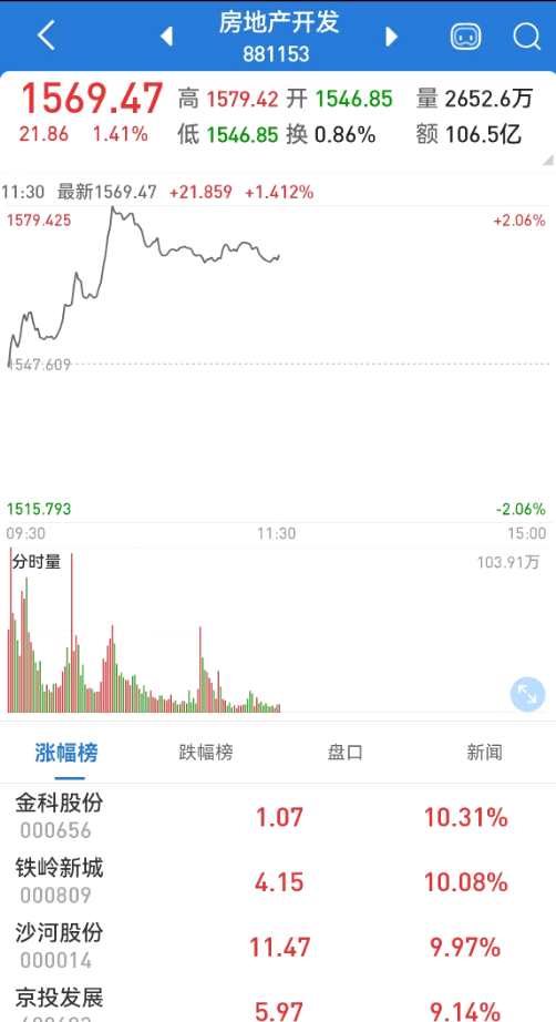 與蘋果概念相反的是,房地產(chǎn)板塊今日否極泰來,盤中一度直線拉升漲逾2%,半日成交接近昨日全天成交。金科股份(000656)、鐵嶺新城(000809)、沙河股份(000014)等強(qiáng)勢(shì)漲停。建筑、物業(yè)管理、園林裝飾、建材等相關(guān)板塊紛紛漲幅居前,蕾奧規(guī)劃(300989)20%漲停,中天精裝(002989)、時(shí)空科技(605178)等亦強(qiáng)勢(shì)漲停。