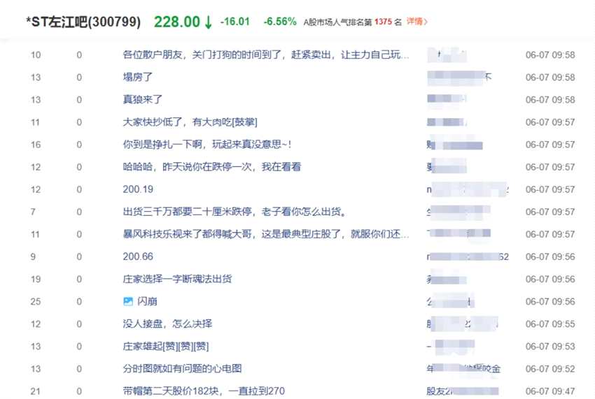 不過(guò),近期*ST左江頻繁出現(xiàn)異動(dòng),6月1日盤(pán)中突發(fā)20CM跌停,嚇壞大量剛剛殺入的股民。而今日再度閃崩,同樣招致散戶們的紛紛吐槽。