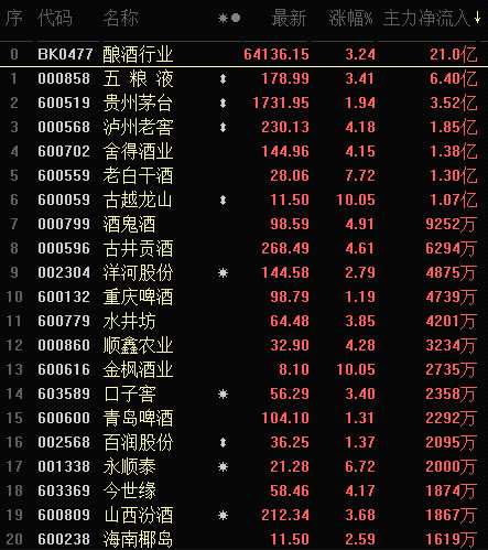 從早盤表現(xiàn)強(qiáng)勢的釀酒行業(yè)看,交易中的40只成份股有38只上漲。資金方面,有21億元大單資金凈流入該行業(yè),居第1位。