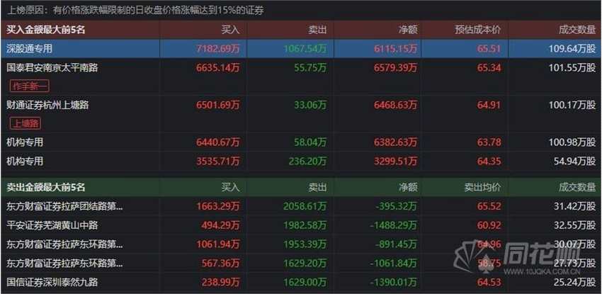 具體來看,機(jī)構(gòu)買入9976.38萬元,賣出294.24萬元,合計(jì)凈買入9682.14萬元。此外,深股通專用、作手新一分別買入7182.69萬元、6635.14萬元。上塘路凈買入6468.63萬元。
