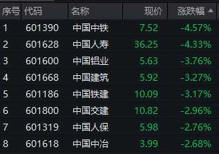“中字頭”個(gè)股方面,中國中鐵(601390)、中國人壽(601628)跌逾4%。
