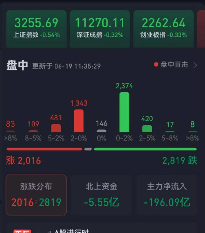 周一(6月19日),三大股指震蕩整理。截至上午收盤,上證指數(shù)跌0.54%,報3255.69點;深證成指和創(chuàng)業(yè)板指分別跌0.32%和0.33%;滬深兩市合計成交額6989.4億元,總體來看,兩市個股跌多漲少。