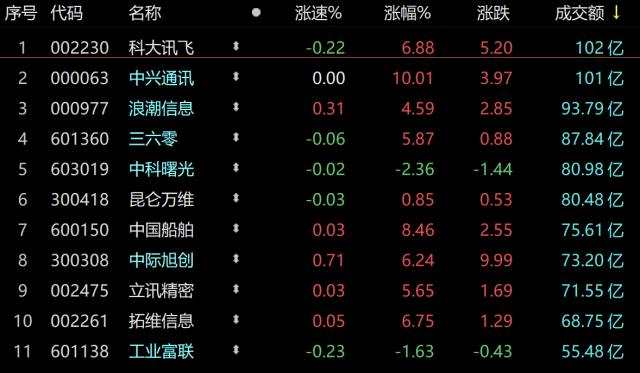 兩市成交額連續(xù)5日突破1萬億,繼續(xù)集中在AI,中興通訊尾盤放量漲停
