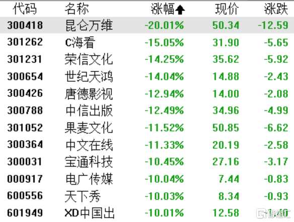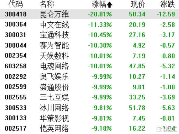 AI概念股持續(xù)走低,游戲、傳媒等應用方向領跌,昆侖萬維盤中觸及20CM跌停,中文在線、榮信文化(301231)、世紀天鴻(300654)跌超10%,三七互娛、奧飛娛樂(002292)、愷英網絡(002517)等多股封死跌停。