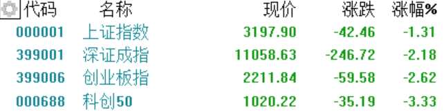 摘要: 三大指數午后跌幅擴大,滬指收跌1.31%失守3200點,深證成指跌2.18%,創(chuàng)業(yè)板指跌2.62%。兩市成交額10220億元,連續(xù)第六個交易日突破萬億元,北上資金凈流入17.47億元。