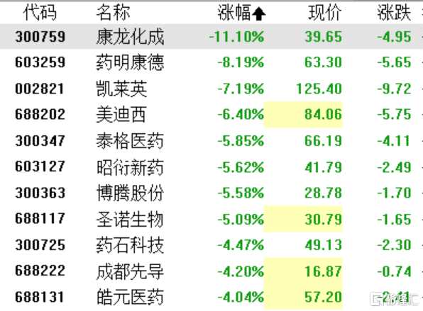 CRO板塊集體下挫,康龍化成(300759)跌超11%,藥明康德(603259)跌超8%,凱萊英(002821)跌超7%,泰格醫(yī)藥(300347)、昭衍新藥(603127)、博騰股份(300363)、圣諾生物跌超5%。