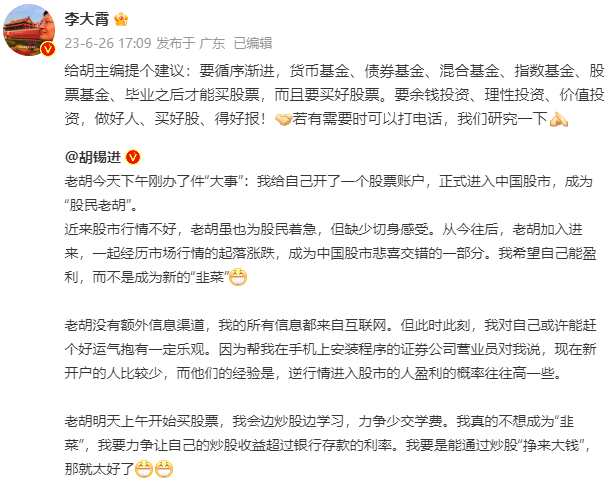 周一下午,高調(diào)官宣將成為 “股民老胡”的著名媒體人胡錫進(jìn),成為了不少網(wǎng)友的關(guān)注焦點(diǎn)。他在個(gè)人微博上發(fā)文稱,他剛剛給自己開了一個(gè)股票賬戶,正式進(jìn)入中國(guó)股市,并表示“明天上午開始買股票”。