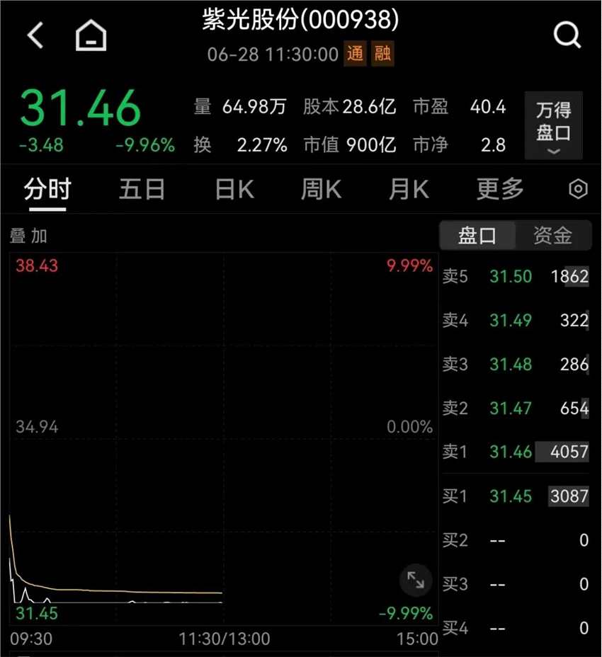 CPO概念股領(lǐng)跌, 浪潮信息 一字跌停, 紫光股份(000938)閃崩 跌停。