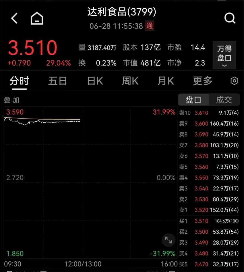28日早盤,另外一只被提出私有化的港股達(dá)利食品也一度大漲超30%。