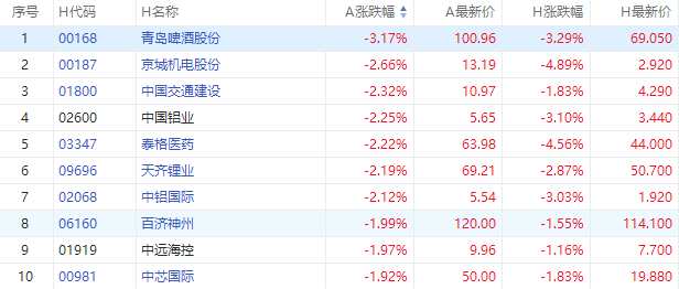 截至A股收盤,AH股跌幅前10如下: