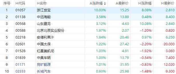 截至A股收盤,AH股漲幅前10如下: