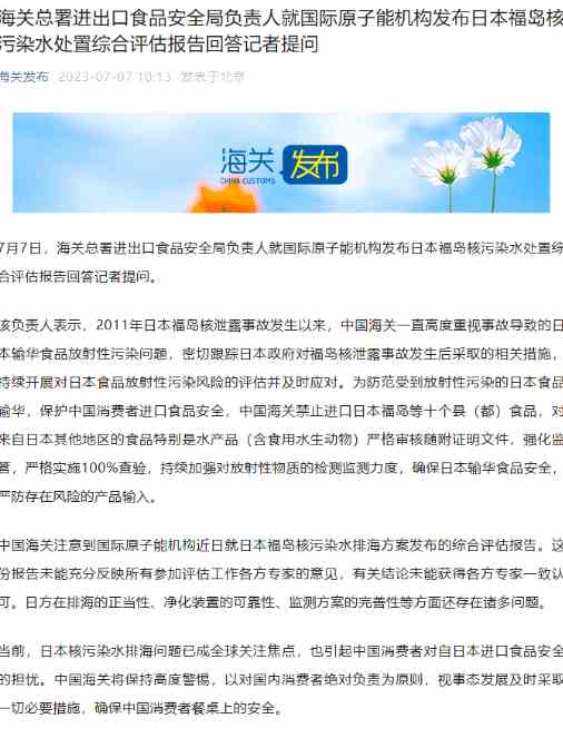 先看一則熱點消息,據海關總署官方微信公眾號消息,7月7日,海關總署進出口食品安全局負責人就國際原子能機構發(fā)布日本福島核污染水處置綜合評估報告回答記者提問。