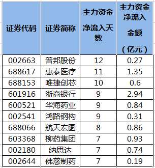 數(shù)據(jù)寶統(tǒng)計(jì),截至7月7日收盤,滬深兩市共有71只個(gè)股連續(xù)5日或5日以上主力資金凈流入。連續(xù)流入天數(shù)最多的是普邦股份(002663),已連續(xù)12個(gè)交易日凈流入;連續(xù)凈流入天數(shù)較多的還有惠泰醫(yī)療、唯捷創(chuàng)芯、浙商銀行(601916)、華海藥業(yè)(600521)、鴻路鋼構(gòu)(002541),分別獲獲11個(gè)、10個(gè)、9個(gè)、9個(gè)、9個(gè)交易日凈流入。