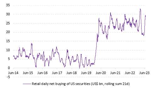 根據(jù)Vanda的統(tǒng)計,流入美國股市的月度凈流入目前平均為14億美元/天,接近去年3月創(chuàng)下的歷史記錄15億美元/天。