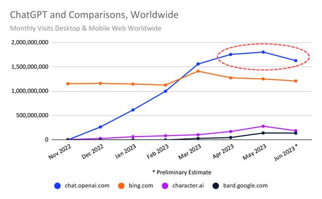 根據(jù)Similarweb的數(shù)據(jù),ChatGPT的網(wǎng)站流量從5月到6月下降了9.7%,這是這個革命性的人工智能門戶自去年11月受到人們廣泛關(guān)注以來首次出現(xiàn)月度流量下降。
