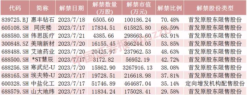 下周解禁比例前十股票