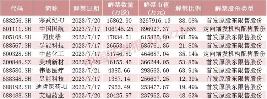 數(shù)據(jù)顯示,寒武紀(jì)-U7月20日將解禁1.59億股,均為首發(fā)原股東限售股份。中國(guó)國(guó)航7月17日將解禁10.61億股,均為定向增發(fā)機(jī)構(gòu)配售股份。同慶樓7月17日將解禁1.78億股,均為首發(fā)原股東限售股份。
