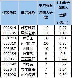 截至7月14日收盤,滬深兩市共有51只個股連續(xù)5日或5日以上主力資金凈流入。連續(xù)流入天數(shù)最多的是佛慈制藥(002644),已連續(xù)12個交易日凈流入;連續(xù)凈流入天數(shù)較多的還有居然之家(000785)、泰慕士(001234)、邁得醫(yī)療、大勝達(603687)、報喜鳥(002154),分別獲獲11個、10個、10個、10個、8個交易日凈流入。