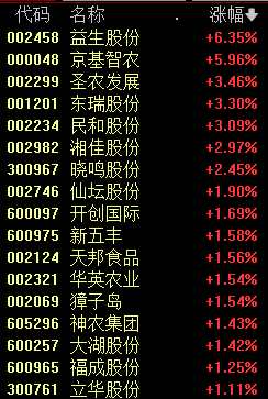 今天上午,養(yǎng)殖業(yè)板塊中,益生股份(002458)、京基智農(nóng)(000048)等個股漲幅居前。