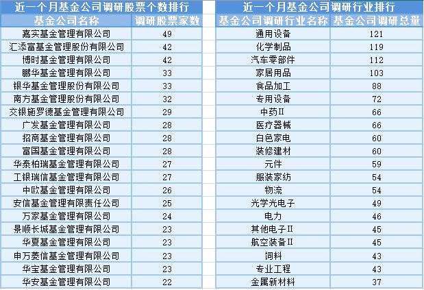 近一個(gè)月(6月18日-7月18日),嘉實(shí)基金參與公司調(diào)研的數(shù)量最多,共調(diào)研49家上市公司,然后調(diào)研較為活躍的還有匯添富基金、博時(shí)基金和鵬華基金,分別調(diào)研42家、42家、33家上市公司;從調(diào)研行業(yè)上來看,基金公司對通用設(shè)備行業(yè)的上市公司調(diào)研次數(shù)最多,共有121次,其次是化學(xué)制品行業(yè),基金公司調(diào)研了119次。