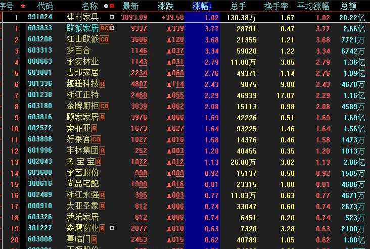 具體看,截至7月19日上午收盤,建材家具板塊漲幅居首,達1.02%。