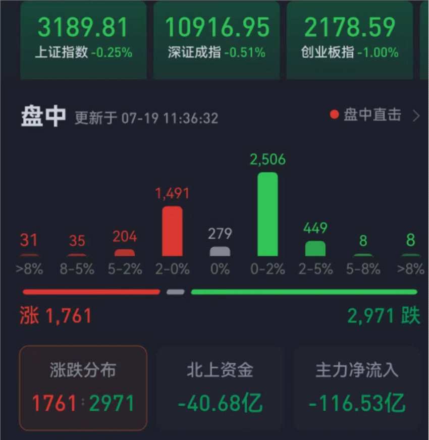 周三(7月19日),三大股指繼續(xù)震蕩整理。截至上午收盤,上證指數(shù)跌0.25%,報3189.81點;深證成指和創(chuàng)業(yè)板指分別跌0.51%和1%;滬深兩市合計成交額4295.1億元,總體來看,兩市個股跌多漲少。