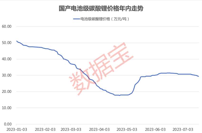 今年以來(lái),碳酸鋰現(xiàn)貨價(jià)格出現(xiàn)明顯波動(dòng),年初碳酸鋰現(xiàn)貨價(jià)格為51萬(wàn)/噸;前四個(gè)月碳酸鋰價(jià)格快速下跌,4月中旬低點(diǎn)為17.65萬(wàn)元/噸,跌幅超過(guò)65%;5月開(kāi)始價(jià)格又急速回升,目前穩(wěn)定在30萬(wàn)元/噸上下。