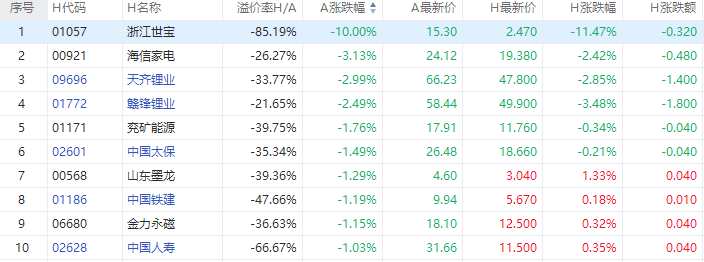 浙江世寶(002703)A股跌停,H股現(xiàn)跌11.47%;海信家電(000921)A股跌超3%,H股現(xiàn)跌2.42%;贛鋒鋰業(yè)(002460)A股跌2.49%,H股現(xiàn)跌3.48%。