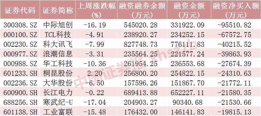上周融資客減倉居前的10只股票分別為中際旭創(chuàng)、TCL科技(000100)、科大訊飛(002230)、浪潮信息(000977)、華工科技(000988)、桐昆股份(601233)、大華股份(002236)、長江電力(600900)、寒武紀-U、工業(yè)富聯(lián)(601138),分別凈賣出9.55億元、6.76億元、4.02億元、3.99億元、2.77億元、2.43億元、2.18億元、2.16億元、2.15億元、1.98億元。從市場表現(xiàn)上來看,這10只股票中除桐昆股份上周上漲2.20%外,其他股票均下跌,中際旭創(chuàng)、寒武紀-U、工業(yè)富聯(lián)均跌逾15%,融資客顯著減倉AI相關概念股。