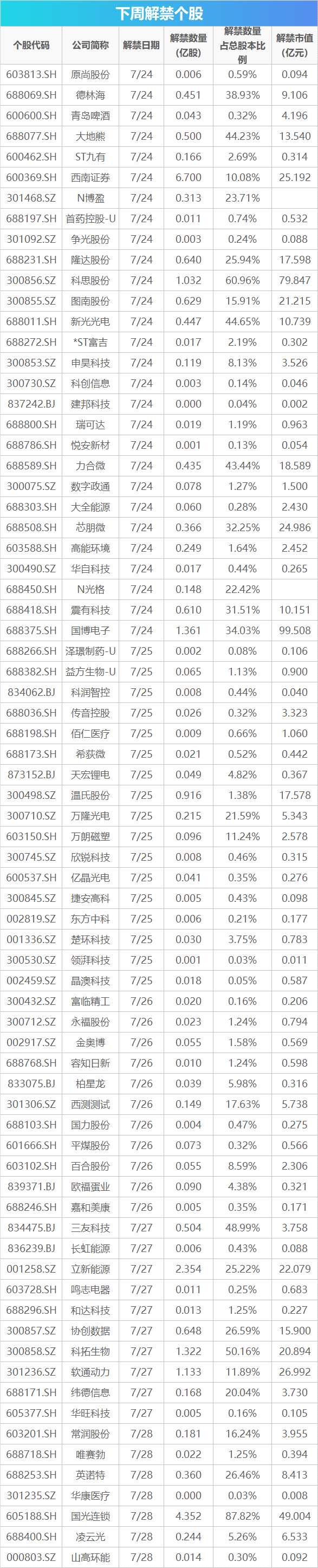 從解禁市值來看,7月24日是解禁高峰期,26家公司解禁市值合計(jì)347.24億元,占下周解禁規(guī)模的62.46%。按7月21日收盤價(jià)計(jì)算,解禁市值居前三位的是:國博電子(99.51億元)、科思股份(79.85億元)、國光連鎖(49億元)。從個股的解禁量看,解禁股數(shù)居前三位的是:西南證券(6.7億股)、國光連鎖(4.35億股)、立新能源(2.35億股)。