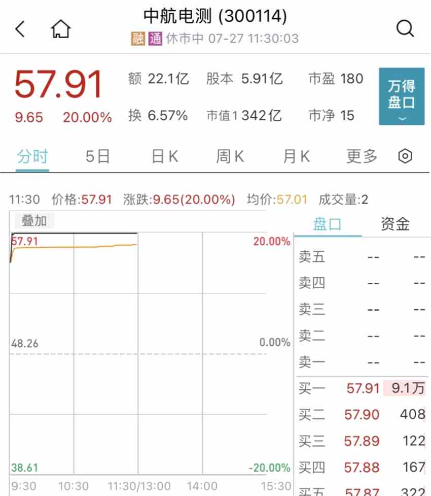 焦點(diǎn)個(gè)股方面,中航電測(300114)開盤2分鐘實(shí)現(xiàn)漲停,總市值為342億元。