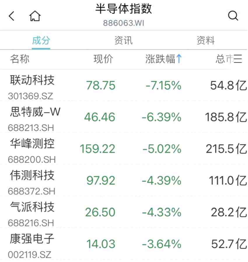 半導(dǎo)體及元件概念跌幅居前,聯(lián)動(dòng)科技(301369)跌超7%,思特威、華峰測控、偉測科技等跟跌。