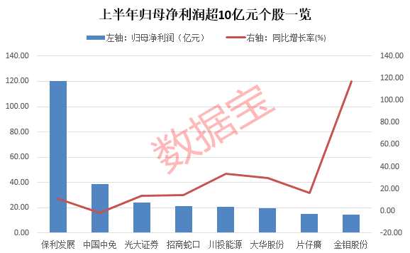 歸母凈利潤方面,保利發(fā)展、光大證券、川投能源(600674)、片仔癀(600436)、金鉬股份(601958)等8股上半年歸母凈利潤額超10億元;除保利發(fā)展的歸母凈利潤超百億元之外,其余個股的歸母凈利潤額均在10億元-40億元的區(qū)間。