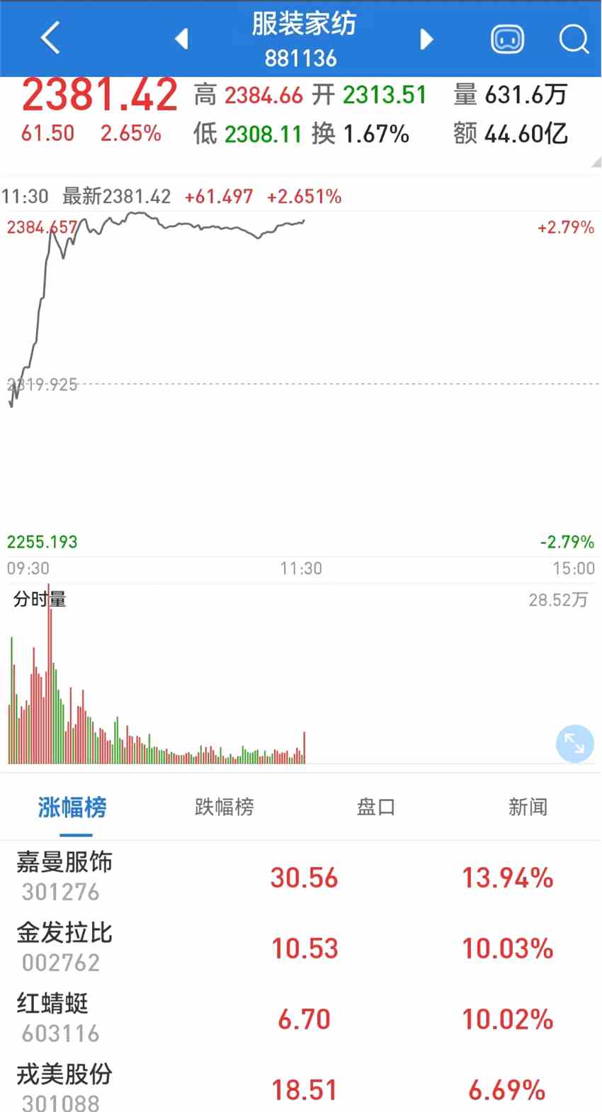紡織服飾股早盤強勢上攻,板塊指數(shù)一度放量漲近2%,創(chuàng)近5個月來新高,并逼近年內(nèi)最高點,半日成交超昨日全天成交。嘉曼服飾(301276)一度直線拉至20%漲停,股價創(chuàng)10個多月新高;金發(fā)拉比(002762)、紅蜻蜓(603116)、華茂股份(000850)等盤中均出現(xiàn)異動快速漲停。