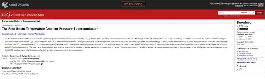 來自韓國的物理學家團隊,近日在預印本網(wǎng)站arXiv上傳了兩篇論文,宣稱發(fā)現(xiàn)了首個室溫常壓下的超導體。論文聲稱:在常壓條件下,一種改性的鉛磷灰石(文中稱為LK-99)能夠在127℃以下表現(xiàn)為超導體。論文一經(jīng)公布,便在網(wǎng)絡(luò)上引發(fā)了熱烈討論。