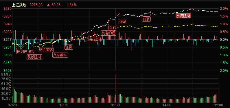 7月28日,A股三大指數(shù)低開,10:38左右滬指翻紅,隨后不斷上揚,證券板塊領漲,滬指最高沖至3280.28點。截至收盤,上證指數(shù)漲1.84%報3275.93點;深證成指漲1.62%報11100.40點,創(chuàng)業(yè)板指漲1.62%報2219.54點。A股合計成交額9494.41億元,較前一交易日增長21.57%;北向資金全天凈買入164.03億元;其中滬股通凈買入83.82億元,深股通凈買入80.21億元。今日A股有3644只個股上漲,1437只下跌,漲跌比為2.54。