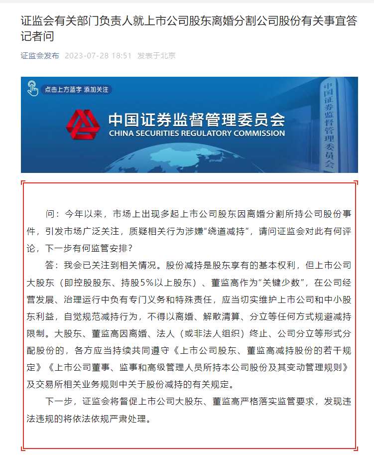摘要: 對(duì)于假離婚真減持,剛剛證監(jiān)會(huì)出手了。證監(jiān)會(huì)有關(guān)部門(mén)負(fù)責(zé)人就上市公司股東離婚分割公司股份有關(guān)事宜答記者問(wèn)問(wèn):今年以來(lái),市場(chǎng)上出現(xiàn)多起上市公司股東因離婚分割所持公司股份事件,引發(fā)市場(chǎng)廣泛關(guān)注,