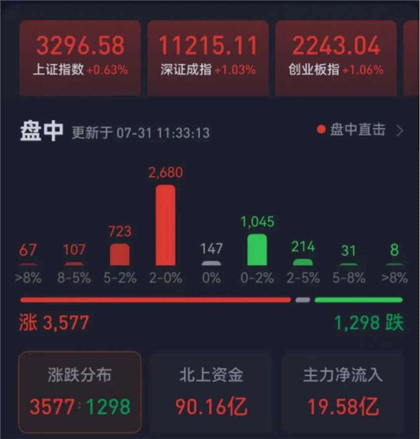 周一(7月31日),三大股指繼續(xù)震蕩攀升,全線飄紅。截至上午收盤(pán),上證指數(shù)漲幅達(dá)0.63%,報(bào)3296.58點(diǎn);深證成指和創(chuàng)業(yè)板指漲幅分別為1.03%和1.06%;滬深兩市合計(jì)成交額7408.6億元,總體來(lái)看,兩市個(gè)股漲多跌少,上漲個(gè)股近3600只。