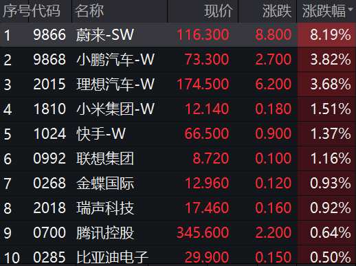 港股市場上,早間恒指低開0.58%,恒生科技微跌0.13%。截至發(fā)稿,恒生科技強勢翻紅,蔚來、理想汽車、小鵬汽車領漲。恒大物業(yè)復牌暴跌50%,領跌港股市場。