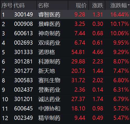 早間睿智醫(yī)藥(300149)一度拉出20CM漲停,景峰醫(yī)藥(000908)、神奇醫(yī)藥、雙成藥業(yè)(002693)漲停。諾思格(301333)、新天地(301277)、賽托生物(300583)、譽衡藥業(yè)(002437)等漲超6%。