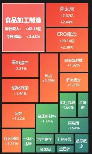 具體看,截至8月3日上午收盤,食品加工制造板塊漲幅居首,達2.48%,資金凈流入達42.18億元。其中,品渥食品(300892)、蓋世食品等概念股漲幅均超10%。