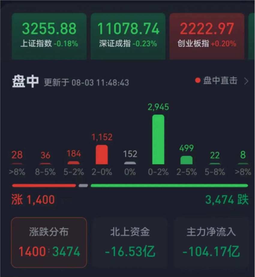周四(8月3日),三大股指繼續(xù)震蕩整理。截至上午收盤,上證指數(shù)跌幅達0.18%,報3255.88點;深證成指跌幅0.23%和創(chuàng)業(yè)板指漲幅為0.20%;滬深兩市合計成交額4749.9億元,總體來看,兩市個股跌多漲少。