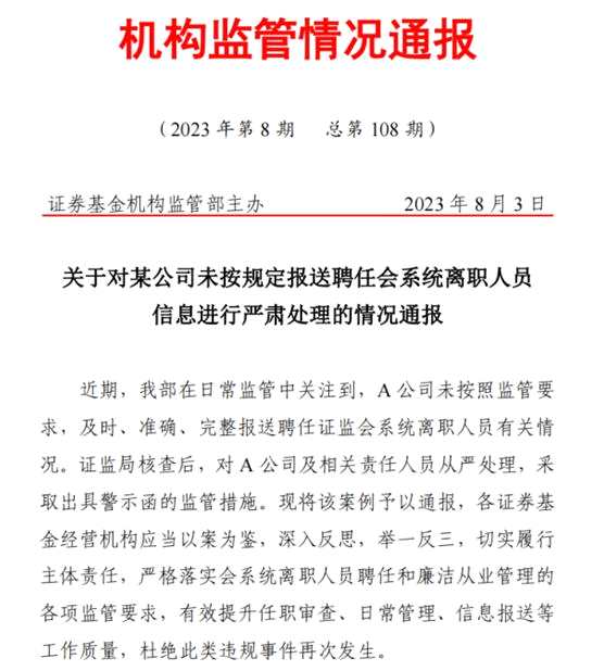 摘要: 8月8日,記者從業(yè)內(nèi)了解到,證監(jiān)會(huì)近日在行業(yè)內(nèi)部將某公司因未按規(guī)定報(bào)送聘任證監(jiān)會(huì)系統(tǒng)離職人員信息而被嚴(yán)肅處理的情況進(jìn)行了通報(bào)。監(jiān)管通報(bào)顯示,2023年7月,證監(jiān)局對(duì)A公司進(jìn)行專項(xiàng)核查,