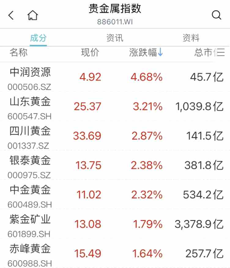 貴金屬板塊拉升,中潤資源(000506)漲超5%,四川黃金(001337)、山東黃金(600547)、銀泰黃金(000975)、中金黃金(600489)等跟漲。